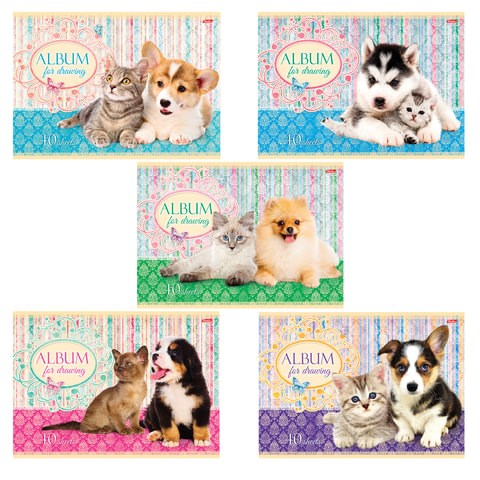 Красочная серия альбомов для рисования с ярким разнообразием в дизайне обложки. Изображение домашних питомцев обязательно привлечет юных художников.