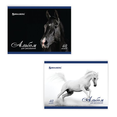 Альбом для рисования, А4, 40 листов, скоба, обложка картон, BRAUBERG, 200х283 мм, "Благородные кони" (2 вида), 103728