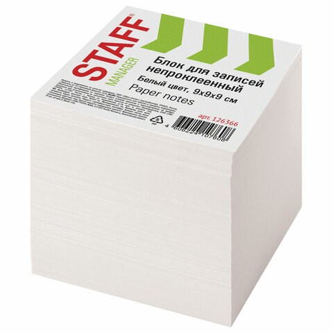 Блок для записей STAFF непроклеенный, куб 9х9х9 см, белый, белизна 90-92%, 126366