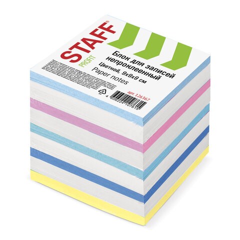 Блок для записей STAFF непроклеенный, куб 9х9х9 см, цветной, чередование с белым, 126367