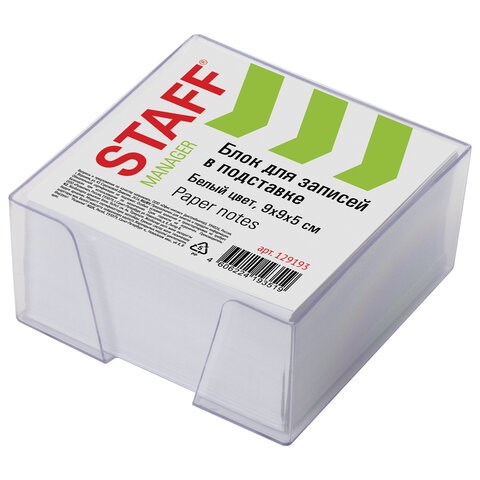 Блок для записей STAFF в подставке прозрачной, куб 9х9х5 см, белый, белизна 90-92%, 129193