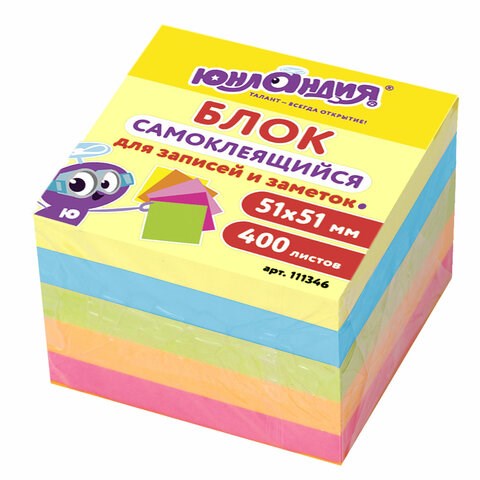 Блок самоклеящийся (стикеры) ЮНЛАНДИЯ НЕОНОВЫЙ 51х51 мм, 400 листов, 5 цветов, 111346