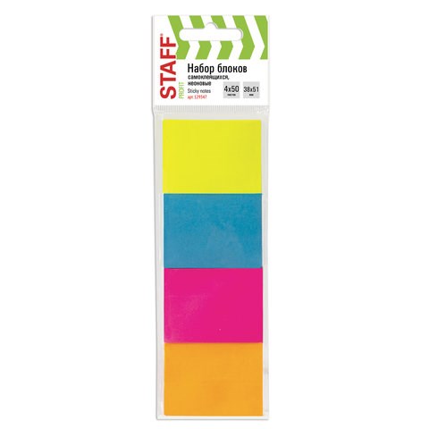 Блок самоклеящийся (стикеры) STAFF, НЕОНОВЫЙ, 38х51 мм, 50 листов, НАБОР 4 штуки, ассорти, 129347