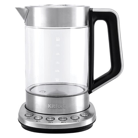 Чайник KITFORT КТ-622, 1,7 л, 2200 Вт, закрытый нагревательный элемент, ТЕРМОРЕГУЛЯТОР, заварник, стекло, серебро