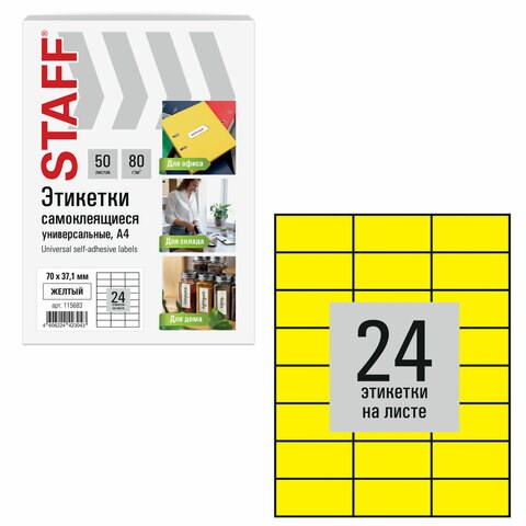Этикетка самоклеящаяся 70х37,1 мм, 24 этикетки, желтая, 80 г/м2, 50 листов, STAFF BASIC, 115683
