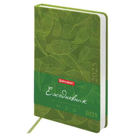 Ежедневник датированный 2025, А5, 138x213 мм, BRAUBERG "Foliage", под кожу гибкий, зеленый, 115854