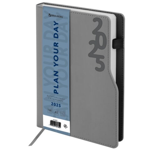 Ежедневник датированный 2025, А5, 150x213 мм, BRAUBERG "Up", под кожу, софт-тач, держатель для ручки, серый, 115843