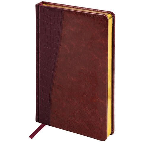 Ежедневник обладает составляющими премиум класса: обложка - изысканная комбинация гладкой глянцевой кожи и материала, имитирующего кожу крокодила, внутренний блок - тонированная бумага с "позолоченным" боковым срезом.