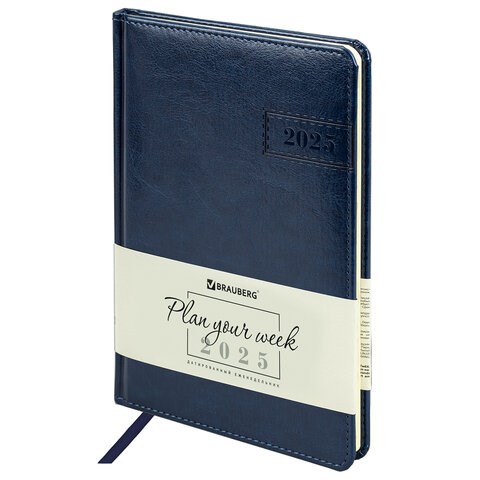 Еженедельник датированный 2025, А5, 145х215 мм, BRAUBERG "Imperial", под кожу, синий, 115964