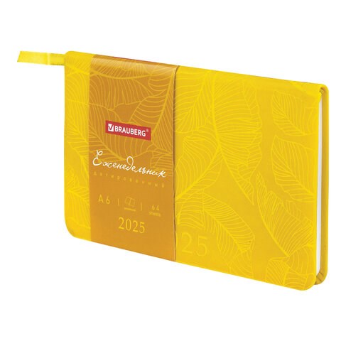 Еженедельник датированный 2025 МАЛЫЙ ФОРМАТ 95х155 мм А6, BRAUBERG "Foliage", под кожу, желтый, 115990