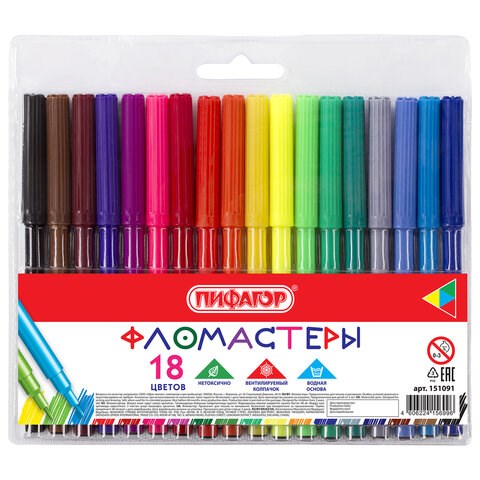 Фломастеры ПИФАГОР, 18 цветов, вентилируемый колпачок, 151091