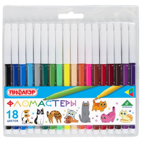 Фломастеры ПИФАГОР "ВЕСЕЛЫЕ ПИТОМЦЫ", 18 цветов, невентилируемый колпачок, 152453