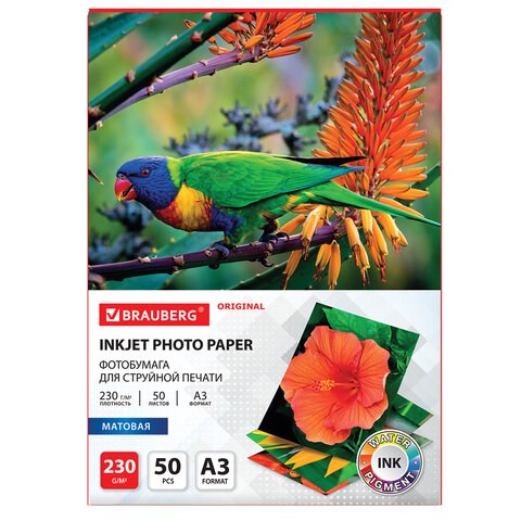 Фотобумага матовая БОЛЬШОГО ФОРМАТА, А3, 230 г/м2, односторонняя, 50 листов, BRAUBERG ORIGINAL, 363997