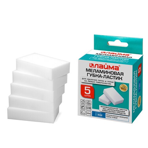 Губка-ластик МЕЛАМИНОВАЯ для удаления пятен, для чистки кухни, уборки, обуви, 9х5,5х2 см, КОМПЛЕКТ 5 шт., колорбокс, LAIMA, 606891
