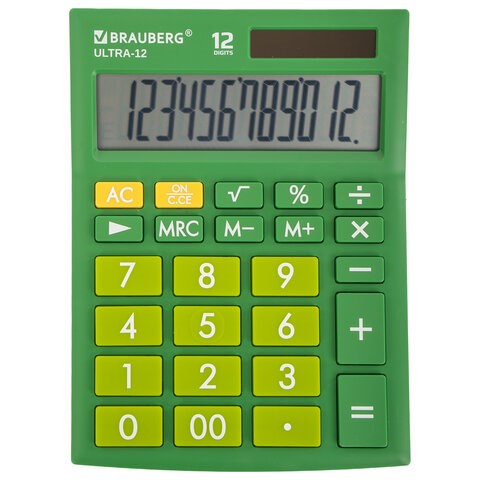 Настольный калькулятор BRAUBERG ULTRA-12-GN. Большой яркий дисплей, устойчивый корпус с прорезиненными ножками и крупная клавиатура с цветной дифференциацией позволяют работать эффективнее с максимальным комфортом.