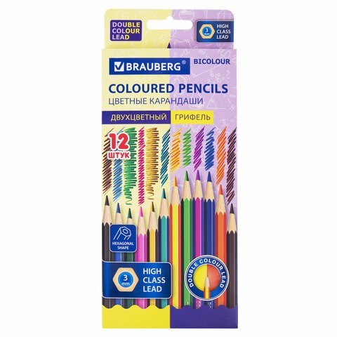 Карандаши с двухцветным грифелем BRAUBERG BICOLOUR, 12 штук, 24 цвета, шестигранные, грифель 3 мм, натуральное дерево, 181855