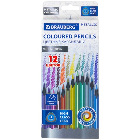 Карандаши цветные BRAUBERG METALLIC, 12 цветов металлик, трехгранные, грифель 3 мм, черное дерево, 181853