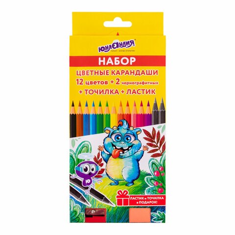 Карандаши цветные ЮНЛАНДИЯ "МОНСТРИК", 12 цветов + 2 чернографитных карандаша + ЛАСТИК + ТОЧИЛКА, шестигранные, натуральное дерево, 181690
