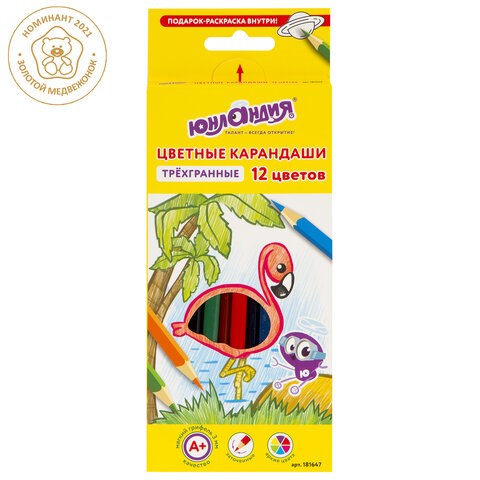 Карандаши цветные ЮНЛАНДИЯ "ТРОПИКИ", 12 цветов, с РАСКРАСКОЙ, трехгранные, грифель 3 мм, натуральное дерево, 181647