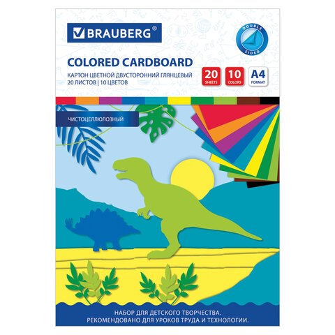 Картон цветной А4 2-сторонний МЕЛОВАННЫЙ, 20 листов, 10 цветов, в папке, BRAUBERG, 200х290 мм, 113554