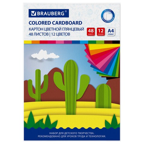 Картон цветной А4 МЕЛОВАННЫЙ, 48 листов, 12 цветов, склейка, BRAUBERG, 200х290 мм, 113552
