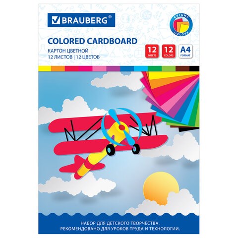 Картон цветной А4 немелованный, 12 листов 12 цветов, в папке, BRAUBERG, 200х290 мм, "Самолет", 113556