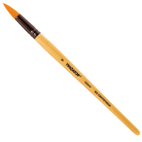 Кисть ПИФАГОР, СИНТЕТИКА, круглая, № 9, деревянная лакированная ручка, с колпачком, пакет с подвесом, 200849