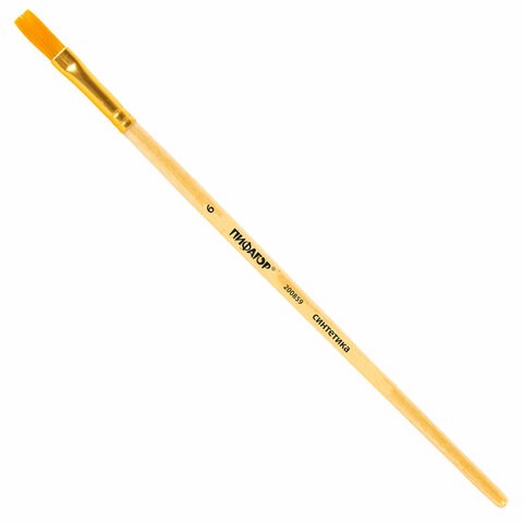 Кисть ПИФАГОР, СИНТЕТИКА, плоская, № 6, деревянная лакированная ручка, с колпачком, пакет с подвесом, 200859