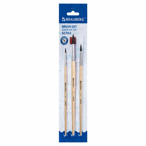 Кисти BRAUBERG, набор 3 шт. (белка, круглые № 2, 4, 6), блистер, 200216