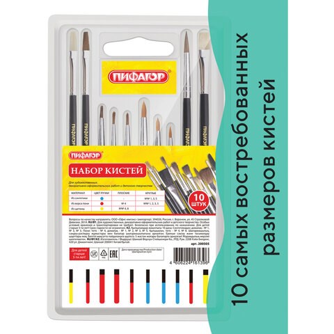 Набор из десяти кистей разного размера и типа ворса ПИФАГОР предназначен для детского творчества в образовательных учреждениях и дома.
