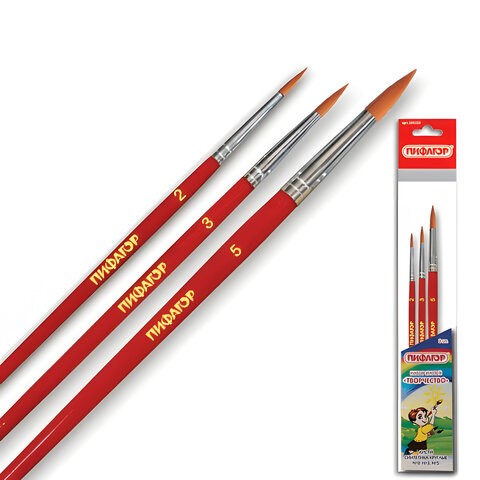 Кисти ПИФАГОР, набор 3 шт. (СИНТЕТИКА: круглые № 2, 3, 5), пакет с европодвесом, 200226