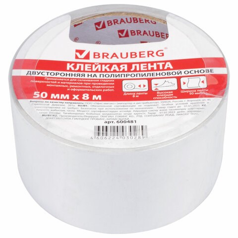 Клейкая двухсторонняя лента 50 мм х 8 м, ПОЛИПРОПИЛЕНОВАЯ ОСНОВА, 90 микрон, BRAUBERG, 600481