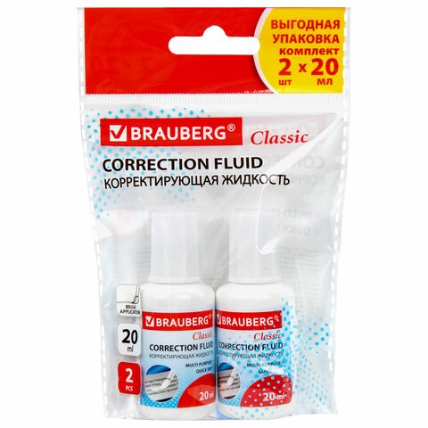 Корректирующая жидкость, 20 мл, ВЫГОДНАЯ УПАКОВКА, КОМПЛЕКТ 2 штуки в пакете, BRAUBERG "Classic", 271919