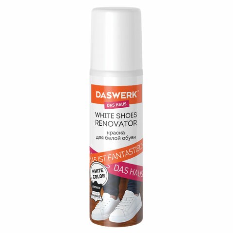 Высокоэффективная жидкая крем-краска DASWERK на водной основе для обновления и восстановления внешнего вида белой обуви, аксессуаров и других изделий из кожи и текстиля. Удобный аппликатор позволяет равномерно обработать все изделие.