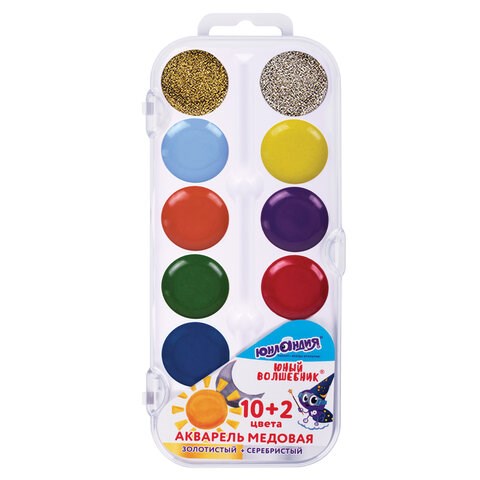 Краски акварельные ЮНЛАНДИЯ "ЮНЫЙ ВОЛШЕБНИК", медовые, 10+2 цвета (золото+серебро), круглые кюветы, пластик, 192360