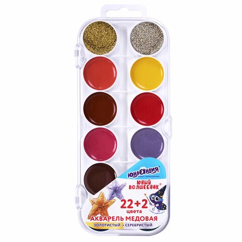 Краски акварельные ЮНЛАНДИЯ "ЮНЫЙ ВОЛШЕБНИК", медовые, 22+2 цвета (золото+серебро), круглые кюветы, пластик, 192361