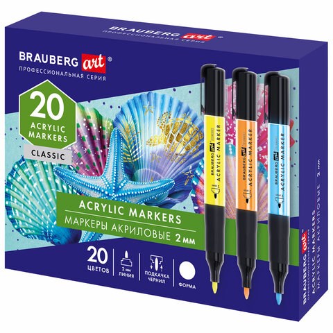 Маркеры акриловые для рисования и хобби, 20 ярких цветов, линия 2 мм, BRAUBERG ART CLASSIC, 152520