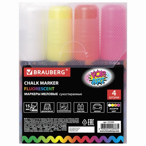 Маркеры меловые "POP-ART", НАБОР 4 ЦВЕТА, 15 мм, стираемые, для гладких поверхностей, BRAUBERG, 151545