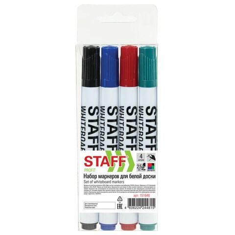 Маркеры стираемые для белой доски НАБОР 4 ЦВЕТА, STAFF "Profit" WBM-644, 2,5 мм, 151648