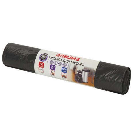 Мешки для мусора 30 л, черные, в рулоне 20 шт., особо прочные, ПВД 20 мкм, 50х60 см, LAIMA, 605330