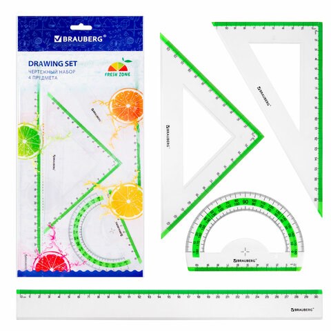 Набор чертежный большой BRAUBERG "FRESH ZONE" (линейка 30 см, 2 треугольника, транспортир) с салатовой шкалой, 210764