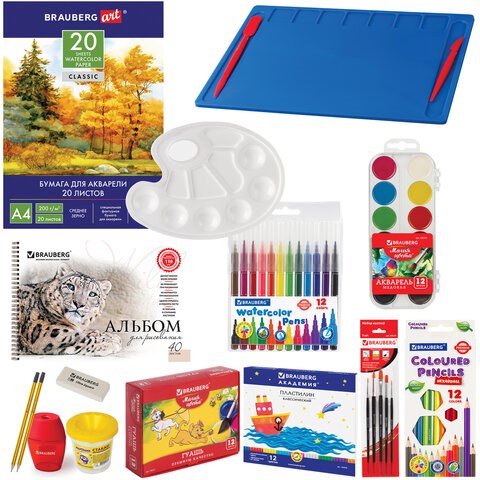 Набор принадлежностей для творчества BRAUBERG "ТВОРЧЕСТВО" для выпускников детского сада и учеников начальной школы в красочной упаковке. Скомплектован на основе рекомендаций учителей и пожеланий родителей.