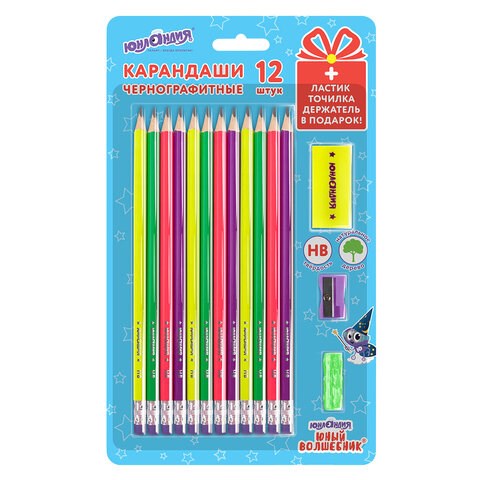 Набор ЮНЛАНДИЯ "Юный волшебник" состоит из 12 чернографитных карандашей, точилки и мягкого ластика. Кроме того, в комплекте забавный держатель для карандаша, который облегчает нагрузку на кисть при письме.