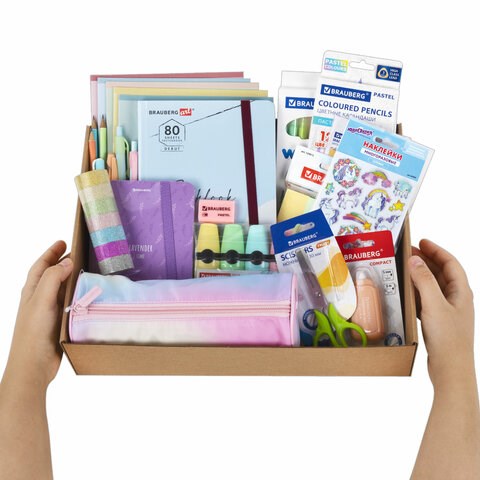 Большой набор канцелярских принадлежностей BRAUBERG "PASTEL" в подарочной упаковке скомпонован из самых необходимых предметов одной тематики, за счет чего смотрится ярко и и интересно.