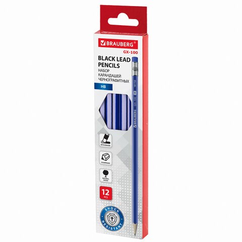 Набор карандашей чернографитных BRAUBERG "GX-100" 12 шт., HB, с ластиком, корпус синий, 181722