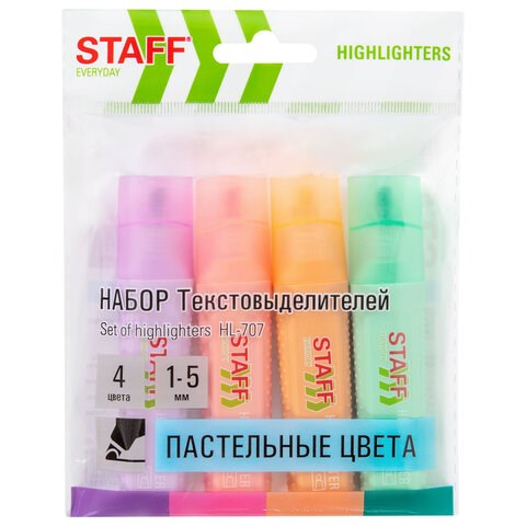 Набор текстовыделителей 4 ПАСТЕЛЬНЫХ ЦВЕТА, STAFF "EVERYDAY HL-707", линия 1-5 мм, скошенный наконечник, 152549