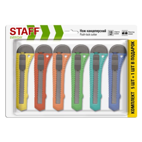Нож канцелярский 18 мм КОМПЛЕКТ "5 шт. + 1 шт. В ПОДАРОК", фиксатор, блистер, STAFF EVERYDAY, 238770