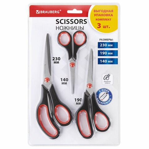 Ножницы BRAUBERG НАБОР 3 шт. (140, 190, 230 мм), черно-красные ручки, ВЫГОДНАЯ УПАКОВКА, 238168