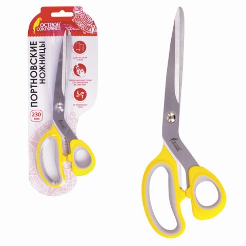 Ножницы портновские ОСТРОВ СОКРОВИЩ ПРЕМИУМ, 230 мм, желтые с резиновыми серыми вставками, 237455