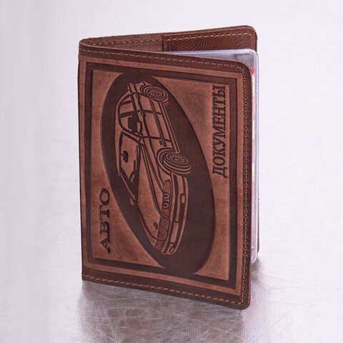 Обложка для автодокументов натуральная кожа краст, машина + "АВТОДОКУМЕНТЫ", коньяк, 238208